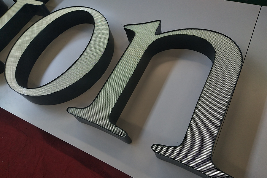 2,天地盖字发光标识制作以低能耗著称,配合铝板冲孔结构对光线的优化利用。