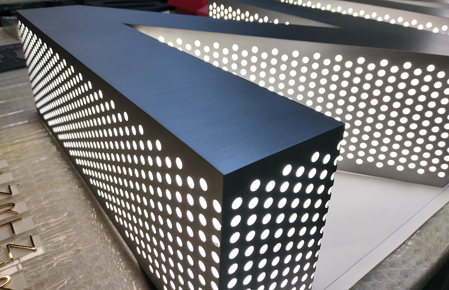 LED冲孔发光字又叫外露发光字,是指用镀锌板、铝板等面板作为字体基板,通过对基板进行切割、冲孔、烤漆、安装、并对字体笔画进行拼装焊接而形成的发光标识。LED冲孔发光字是LED系列发光字体里面的一种,经常用于广告行业。一般冲孔字用于楼顶的情况比较常见,它的出现让广告更直接。