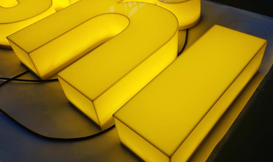 1、夜晚字体明亮醒目(安装一种新型的超亮度发光源,使用寿命长,使它随亚克力板颜色发出耀眼的亮光)。