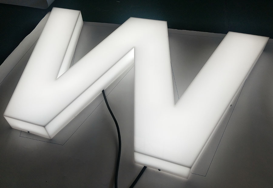 通体发光字夜晚字体明亮醒目(安装一种新型的超亮度发光源,使用寿命长,使它随亚克力板颜色发出耀眼的亮光)。立体感强(壁板放得越厚,立体感越强)。色彩鲜明(各色亚克力板材任意挑选,壁板与面板颜色随意组合)。
