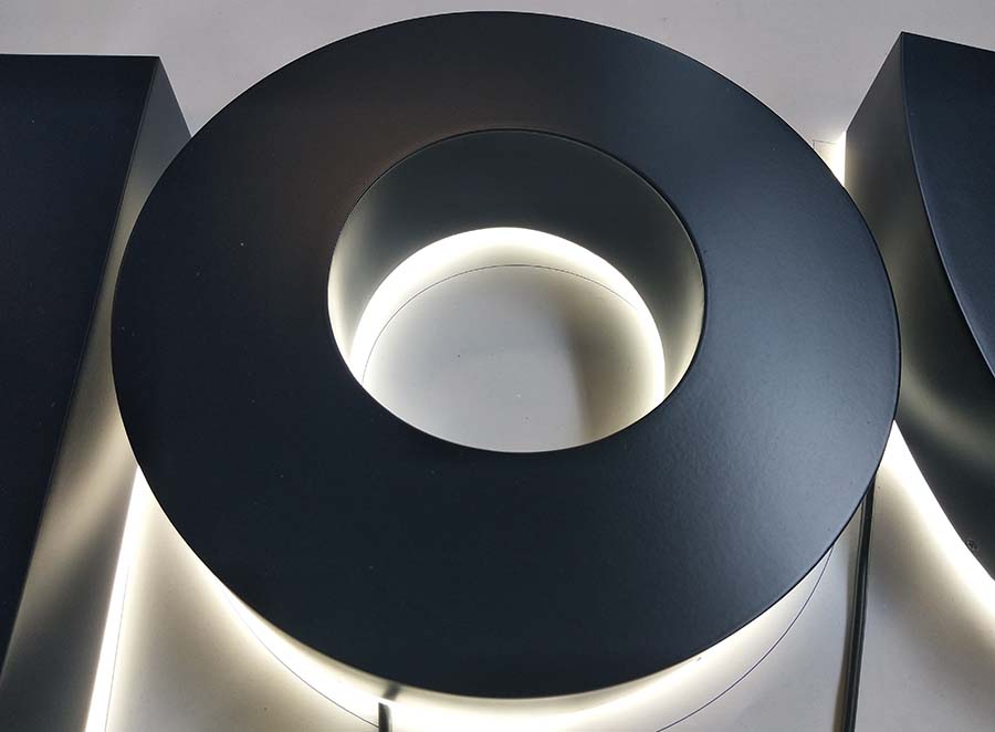 精工制作的不锈钢发光工艺字制作是先通过激光切割机切割金属板材,激光切割的效果比普通制作的金属发光工艺字效果好,边缘光滑没有毛刺,焊接时也采用激光焊接机进行无缝焊接。精工制作的发光工艺字最细的笔画可以达到0.8mm。成品发光工艺字制作效果精细,没有焊接痕迹,适用于商场、写字楼等室内场所。