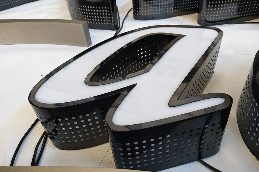 2,镂空发光字标识标牌制作采用低功耗 LED 光源,比传统霓虹灯省电 80% 以上;优质灯珠寿命可达 10 万