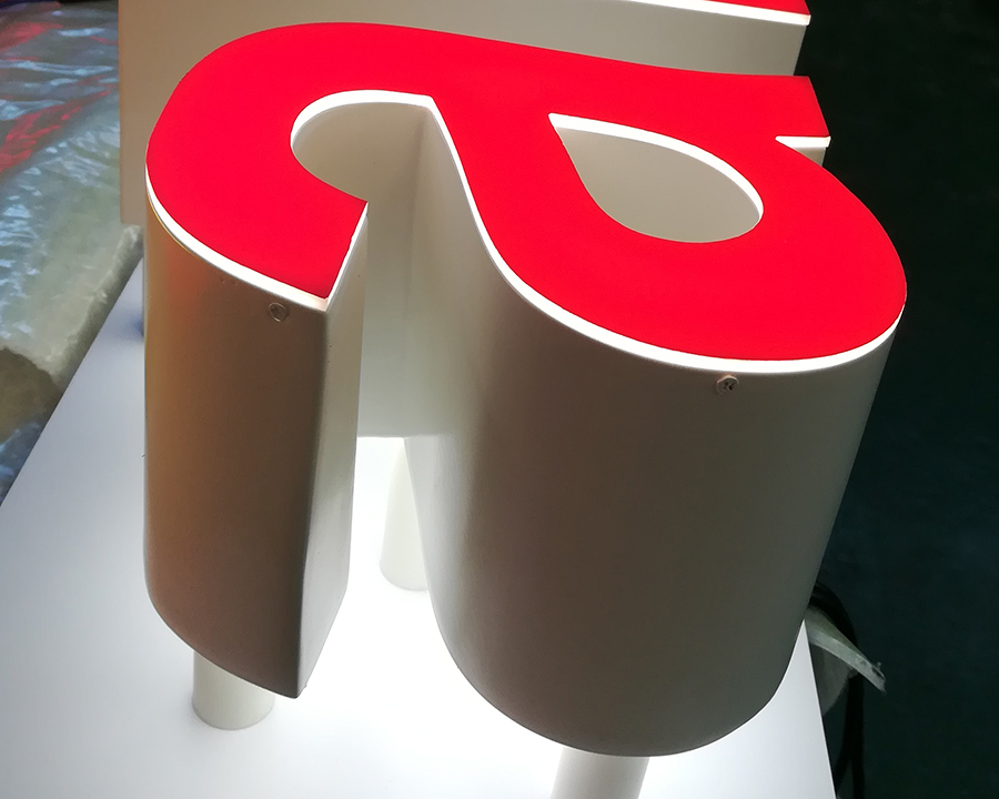 通体发光字形象墙采用亚克力材料通过加热折弯、固化、围边、粘贴制作而成,通体发光字的正面、侧面、底部均可透光,故又称为三面发光字,通体发光字高亮度、立体感强,整体都由亚克力材料围成,无金属材料,耐候性能强,亚克力良好的光泽效果,使得形象墙在不发光状态下也具备良好效果,通体发光字是一款兼顾昼夜发光效果的广告字。