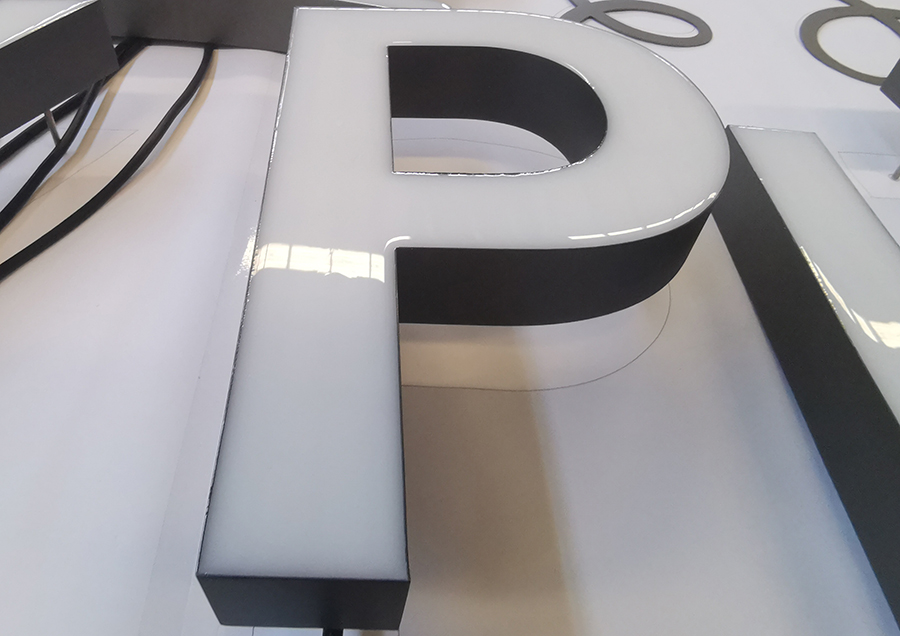 我们先来说说树脂发光字的优点,能风靡发光字界那么久必有其独到之处。树脂发光字的树脂层拥有一层特有的匀光层,能对光源有效反射扩散,与传统的亚克力发光字相比,使用相同的灯源,树脂发光字的表现力更强。树脂发光字的树脂层从倒树脂到凝固形成一个圆润的树脂层,隐约中有点吸塑效果。打光高亮,发光面圆润微凸光滑均是其标识性象征。