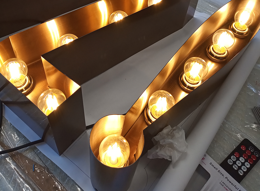 外露发光字即铁皮字、不锈钢字、铝字、钛金字表面冲孔装上LED单颗防水灯串,外露发光字的制作材料常用的有:亚克力板,镀锌板,不锈钢,钛金板。如果将其装置于服装门店,它可以显得时尚复古;如果将其装置于一些特主题餐厅或咖啡馆,它可以显得浪漫喜庆;外露发光字采用的led点光源,较比常规的外露灯,点光源的尺寸要比常规的外露灯大。点光源宽度在3-8cm不等。大尺寸的外露灯也是展现该款外露字的独特气质非常重要的一个因素。由于其灯源外观类似一个灯泡,因此,也有灯泡字和球泡字之称。