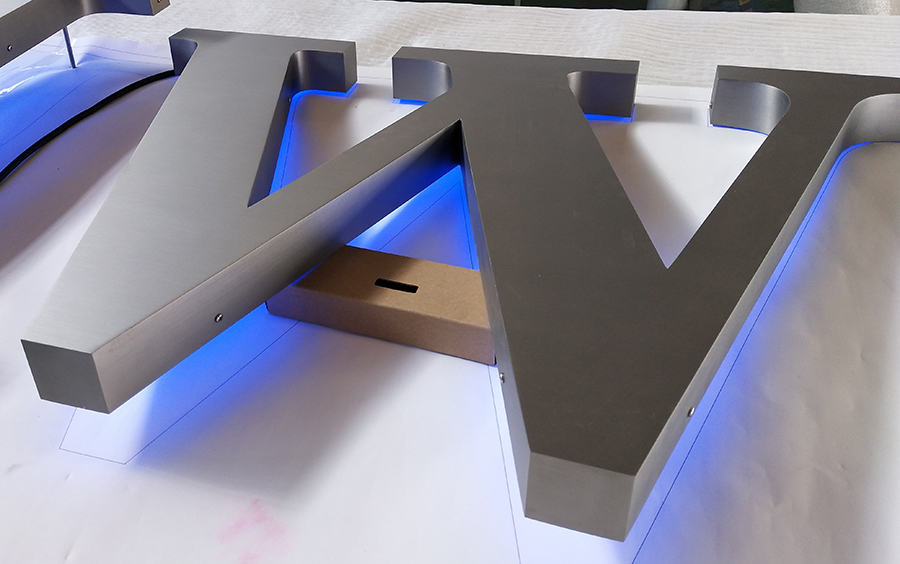 拉丝不锈钢发光字制作主要用于广告招牌、广告标识。立体的个性,沉实的金属感,给人一种无法抵御的高端、大气、上档次的魅力。拉丝不锈钢发光字制作过程比较复杂,多个步骤的制作工艺。不锈钢拉丝字制作工艺是用拉丝不锈钢板经过镭射激光切割或数控水切割后,围边焊接、打磨、抛光。主要应用于招牌、形象墙、各种标识标志、楼宇提示标识、高档品牌标识的户内外广告产品应用,还有可用于现代化办公室的标识。